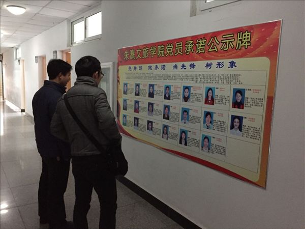 会后,朱熹文旅学院党总支对对党员教师的承诺进行总结,整理成文字材料,并将这些承诺做成“公示牌”张贴在系部办公室走廊的文化墙上,便于进一步接受党内与党外、教师与学生的监督。让党员老师时刻牢记党的宗旨,时刻铭记自己的承诺,自觉树立好先锋模范形象。