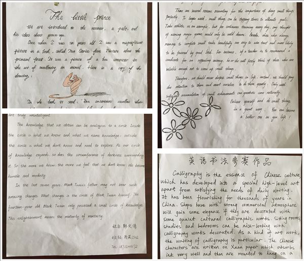 根据赛项要求,英语书法作品应该书面整洁、书写工整,无涂改痕迹;字母书写规范,字体美观大方,无拼写错误;结构严谨,整体设计美观,彰显个性创意;作品内容积极向上。从递交的参赛作品上看,我院学生英语书写的整体水平较高,体现出同学们对英语语言和英语文学的热爱。