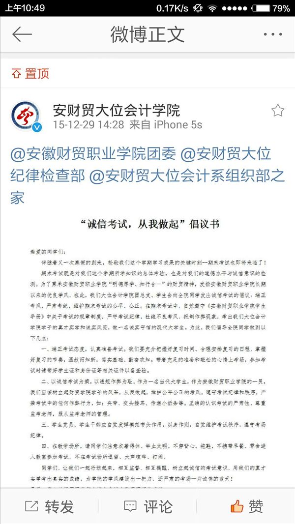 12月29日,大位会计学院官方微博发布了《诚信考试,从我做起》的倡议书,学生秘书武军老师也在自己的腾讯空间、微信上发表了对诚信考试的观点,不少同学网上点赞表示同意。