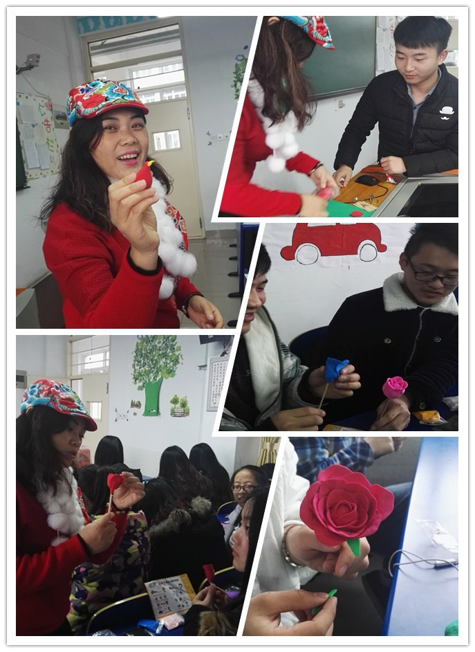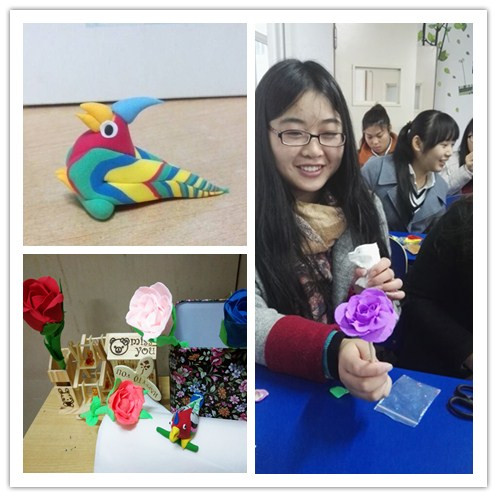 在张老师的指导下,同学们还制作了各色的玫瑰花,并学习了康乃馨的制作技法。