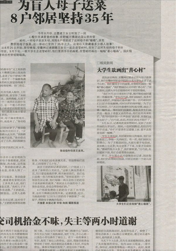 在该村志愿绘画期间,同学们遇到了来到该村采访的新安晚报的记者,10月8日,该报A05版报道了我院同学们的志愿行为。