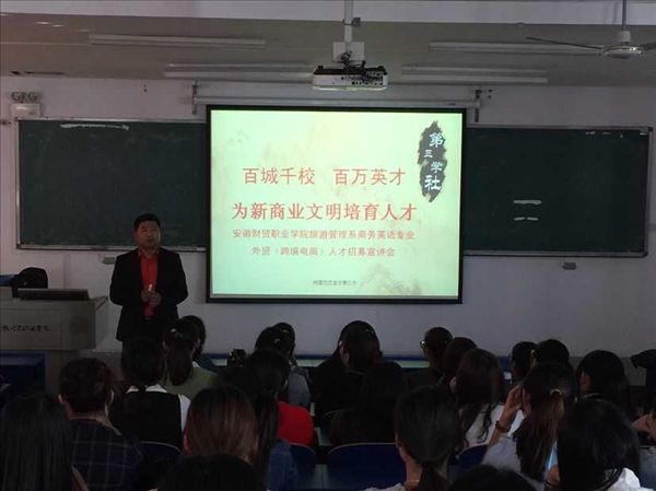 10月14日下午,旅游管理系商务英语教研室邀请肥轩昂教育咨询有限公司总经理王磊,“百城千校,百万英才,为新商业文明培育人才”为题举办了一场外贸跨境电商人才招聘宣讲会,商务英语教研室主任谢峰主持宣讲会。