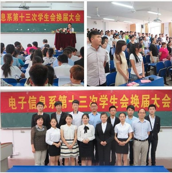 6月17日下午,电子信息系第十三次学生代表大会在6201教室隆重召开,学生处处长薛卫敏,系党总支书记程众、系副主任张成叔,教研室主任汪永涛、陈祥生、王会颖、陆慧及2014级所有辅导员老师出席了大会。