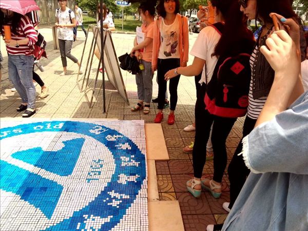 这幅校徽在学院报告厅公开展出后,吸引了许多目光,路过的同学们纷纷驻足观赏,不少还用手机拍下了与这幅校徽的合影。