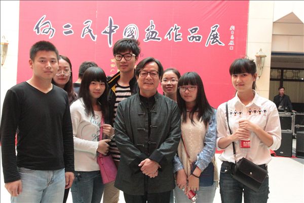 经与安徽省美术家协会联系,同学们得到了这次与大师和大师们作品亲密接触的机会。除了何二民本人,本省多位知名画家也现身此次画展中。不仅同学们近距离观摩了大师的作品,何二民老师还应邀作了作品讲解,传授了技法技巧,并与同学们合影留恋。