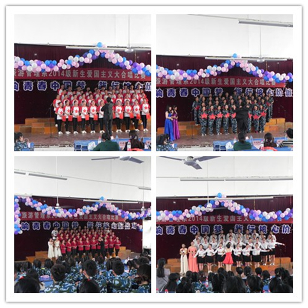 10月8日下午,5103教室座无虚席,旅游管理系“唱响青春中国梦、践行社会主义核心价值观”2014级新生爱国主义大合唱比赛在这里隆重举行。学生处处长薛卫敏,国际交流中心主任邵会如,保卫处副处长陈浩然,旅游管理系主任刘葆、党总支副书记宋凌云,学生处学生资助中心主任王学峰,图书信息中心张琼老师担任评委。