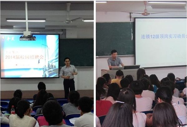 十足集团等实训基地相继在学院进行了宣讲,同学们根据自己的情况,合理的选择适合自己的实习单位和实训岗位。各班辅导员利用班会的形式,就实习期间的生活、安全和学习方面对学生进行教育工作。行知管理学院还召开了“连锁经营专业顶岗实习动员大会”,方春龙副院长和陆影教授出席会议并讲话,就顶岗实习期间相关工作进行部署和动员。