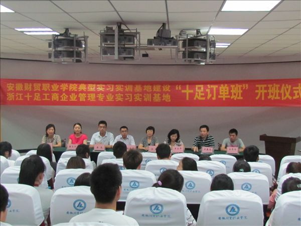 5月28日下午,行知管理学院与人本集团浙江十足商贸有限公司联合筹建的“十足订单培养班”开班仪式在3D实训室隆重召开。开班仪式由行知管理学院副院长方春龙主持。浙江十足商贸有限公司总经办主任刘瑜平、人力资源部招聘经理黄昆,学院教务处处长余敏、招就处副处长王永平出席了此次开班仪式。参加此次开班仪式的还有行知管理学院党总支副书记唐学华,工商管理教研室主任胡芳,目前已在十足就业并担任店长的2011级学生代表王厚石,以及经双向选择进入“十足订单培养班”的全体同学。