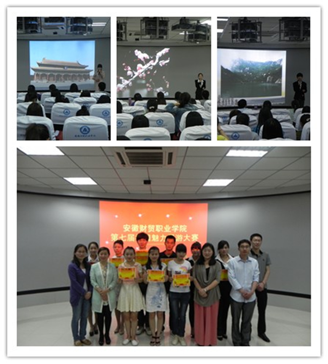 旅游1301班陈白雪和会计1309班孙硕分别介绍了美丽的太平湖和拥有世界地质公园称号的天柱山景区,凭借着他们出色的现场发挥,双双荣获二等奖;陈白雪同学的即兴演讲“永不放弃”,表达流利,内容积极向上,精彩的表现使她同时又获得了“最佳口才奖”;孙硕同学的模仿秀才艺表演赢得了满堂彩,最终获得了“最佳才艺奖”。此外,旅游1301班方子嫣、郑婷婷,商英1303班叶欢获得三等奖。旅游1301徐凯华、工商1301肖国爱、商英1303储照丽和能源1201应慧获得优秀奖。比赛结束后旅游管理教研室主任钱晓慧老师对选手们的表现进行了综合点评。