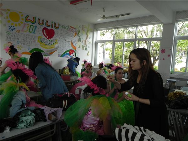 5月1日上午8时,一个个朝气蓬勃、神采飞扬的女孩,手提色彩斑斓的化妆包从四面八方赶向化妆间,为学院建校50周年暨学院第十一届校园文化艺术节文艺晚会的演职人员做上台前的化妆准备。彩妆班志愿报名的41人组成的的化妆团队要为近400人次的演员及礼仪队化妆,任务庞大而繁重。但化妆队员无怨言、不气馁,坚持不懈、迎难而上,以自己最好的状态投入到任务中,展现了化妆队认真负责的工作态度。指导老师宋凌云一大早将化妆用品分发到各个小组,并亲自到教室为各节目定妆,在她的带领下,所有化妆队员们流水作业:有人打底、有人画腮红、还有人画眼影。化妆刷在姑娘们的手中幻化为舞动的精灵,舞蹈演员们精致的面容顷刻即成,为晚会的精彩纷呈奠定了坚实的基础。化妆队员辛勤的劳动成果也得到了院领导的一致肯定,好评如潮。