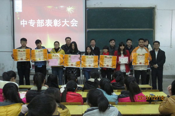 12月18日中午,中专部召开大会,表彰获得上学年学院奖学金、三好学生称号的优秀学生以及在中专部口语大赛、校园歌手大赛等活动中获奖的集体和个人。中专部领导及各班班主任出席大会并为获奖学生颁奖。