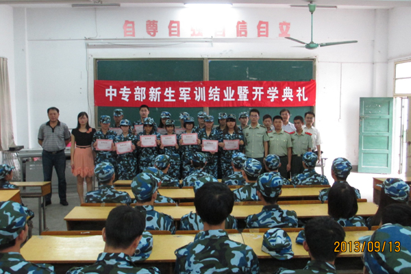 9月13号上午,中专部举行了2013级新生军训结业暨开学典礼,中专部领导张爱民、徐道根、杨声及开展军训工作的武警安徽省消防总队教官们出席了典礼。