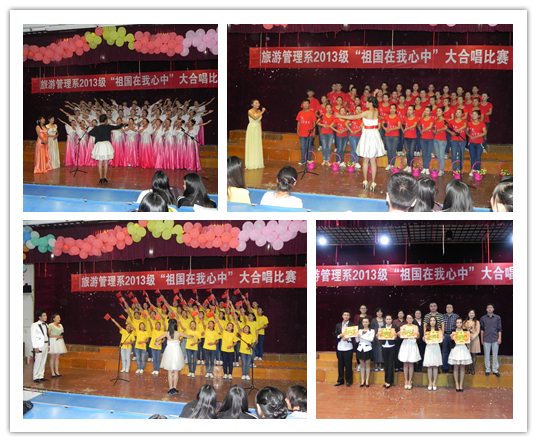 青春的旋律张扬着个性,整齐有力的合唱震撼着评委们的心灵。在中华人民共和国成立64周年即将到来之际,9月26日晚,旅游管理系2013级新生“祖国在我心中”大合唱比赛在5103教室隆重举行。学生处处长薛卫敏、保卫处副处长陈浩然、电子信息系党总支书记程众、旅游管理系党总支副书记宋凌云等出席比赛并担任评委。