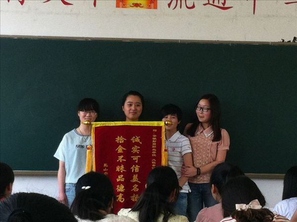 5月16日,昆山乐昂电子有限公司的工作人员将一封感谢信送至我校学生处,将一面写着“拾金不昧品德高,诚实可信美名扬”的锦旗赠送给大位会计学院审计实务1101班项静文、魏成成、常甜甜、王晓萍四名同学。