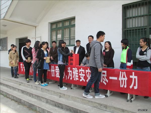 4月24日,教学楼一楼拉起了“节省一分零钱,献出一份爱心,为雅安灾区尽一份力”的募捐标语,各班班长纷纷走向募捐箱,将班上同学平时节省下来的钱投入箱内。灾害无情,人间有爱。此次共募集善款5562元,这些善款将由学院统一转交给相关赈灾部门,为雅安重建略尽绵薄之力。
