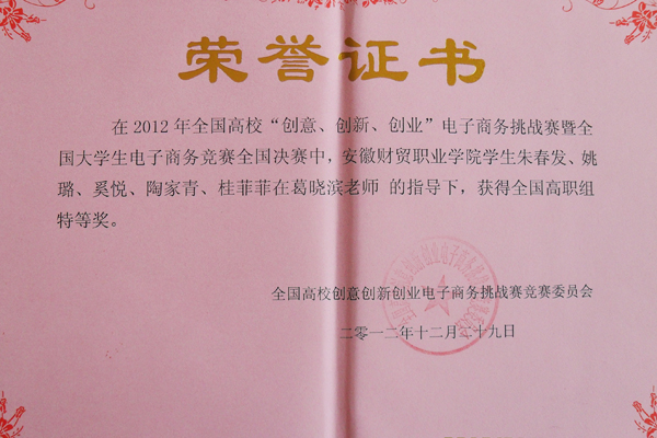 12月29日,雪岩贸易学院电商1102班朱春发、姚璐和电商1101班奚悦、陶家青、桂菲菲等同学组成的参赛队,在全国高校“创意 创新 创业”电子商务挑战赛暨全国大学生电子商务竞赛(高职组)中荣获特等奖。