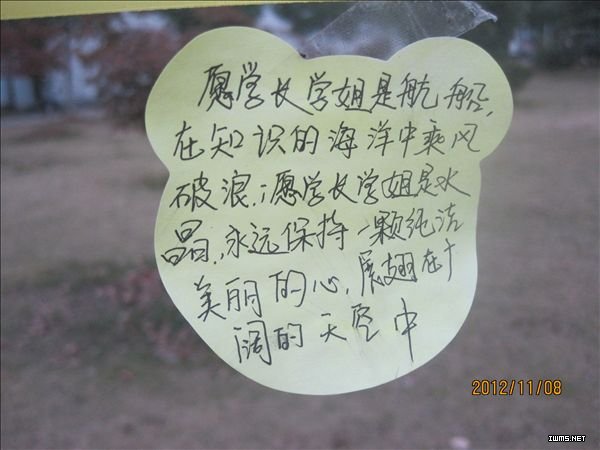 近日,雪岩贸易学院学生会学习部主办“情感一线牵”活动。活动号召2011级、2012级学生用灵巧的双手、朴实的纸笔书写对毕业生的浓浓深情。目前,这些五颜六色的纸鹤、娟秀整齐的纸片在学院教学楼附近被统一悬挂,他们随风飘扬,承载着在校同学们对全体2013届毕业生深深的牵挂和真挚地祝愿。