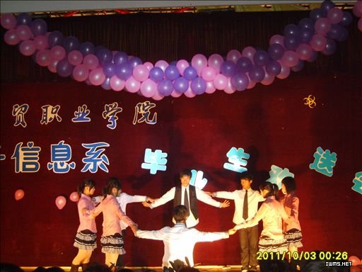 晚会在一段优美的开场舞中开始,校园华尔兹《青春舞动》展现了大学生的青春与活力;手语舞《爱因为在心中》,表达了爱是我们每个人心中永恒的主题;双簧《医院相亲 》幽默诙谐;舞蹈《双人舞》、《舞林大会》,小品《考试风波》、《疯狂大课堂》、《三打白骨精》节目等精彩纷呈,赢得了满堂的喝彩和掌声;《大学三年》带领同学们一起回顾了大学生活的点点滴滴,追忆曾经的逝水年华,表达了对母校的依依不舍之情。