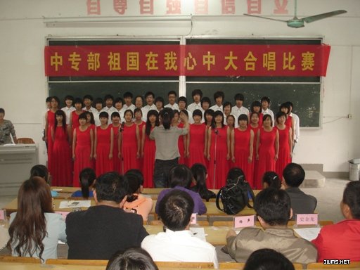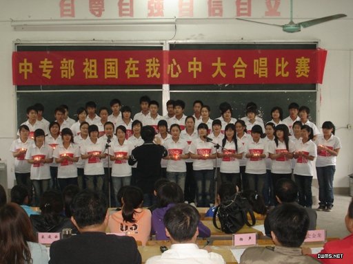 10月13日,中专部在阶梯教室隆重举办了“祖国在我心中”2010级新生大合唱比赛。中专部主任张爱民、副主任宋凌云、副主任徐道根、管委会副主任杨声以及刘文溢、梅章骏等老师应邀观看了比赛并担任比赛评委。