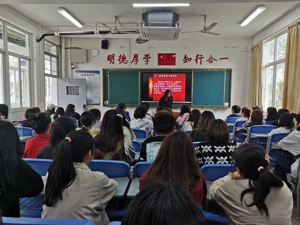 汤玉燕详细介绍了共青团性质、团员的权利与义务、入团的基本要求与程序、团旗、团徽、团歌等,现场通过播放视频《如何入团》《共青团的历史》《共青团的改革与发展》,让在座的同学们深刻地了解了有关于团的知识。同时,通过讲述共青团工人活动和中国共产党的重大历史事件,让同学们认识到大力弘扬伟大的民族精神和时代精神的重要性,让凝心聚力的兴国之魂,强国之魂融入现代建设的过程中,也让大家明确了共青团员作为党的有力助手和后备军所要承担的责任。