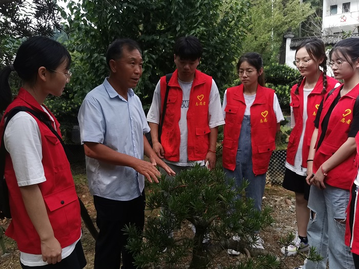 歙县雄村镇卖花渔村自唐末发展至今,从肩扛担挑发展到了线上线下齐头并进销售,成功脱贫致富成为了国家级美丽乡村示范村和电子商务示范村,实现了生态宜居村庄美,兴业富民生活美,文明和谐乡风美。7月12日至13日,实践团队赶赴卖花渔村,受到省级非遗传人洪定勇老书记的热情地接待,洪定勇详细介绍了“卖花渔村”的由来、徽派盆景发展起源、徽派盆景的发展现状等情况,带领队员们参观了村里徽派盆景种植基地,了解徽派盆景品种、种植方式、定型技艺、养护要点等。活动中,队员们拜访了“徽派盆景制作技艺”非遗传人洪继平,通过盆景修剪实操,学习了解徽派盆景的“一景二盆三基架”、造型手法及造型修剪技艺。