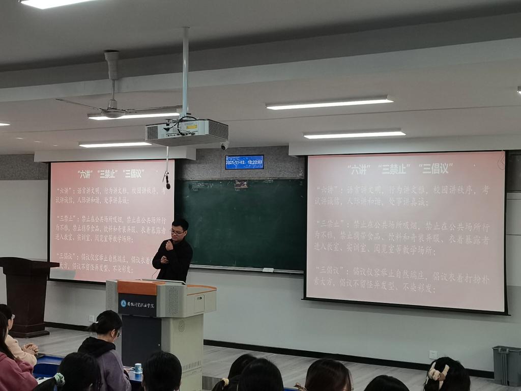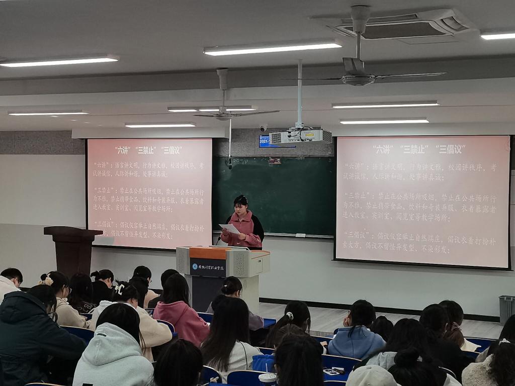 会上,万幸老师就文明规范活动的目的、目标和任务作了解读说明,详细讲解“六讲”“三禁止”“三倡议”的核心内容,并将活动内容、活动形式与在场的老师和同学进行了深入讨论。