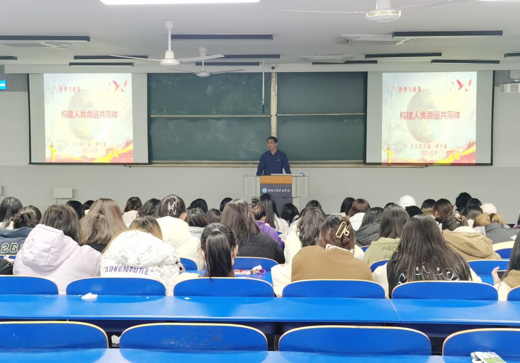历史长河川流不息,人类命运休戚与共。公共教学部党支部副书记何步新以“推动构建人类命运共同体”为题,通过解读人类命运共同体思想的深刻内涵、“一带一路”国际合作的宏伟构想和构建人类命运共同体的历史使命,引导学生充分认清人类社会发展和现实世界发展的客观规律和必然趋势,明晰推动构建人类命运共同体这一重大战略思想,对维护世界和平、促进共同发展、创造人类美好未来将发挥巨大的引领作用。
