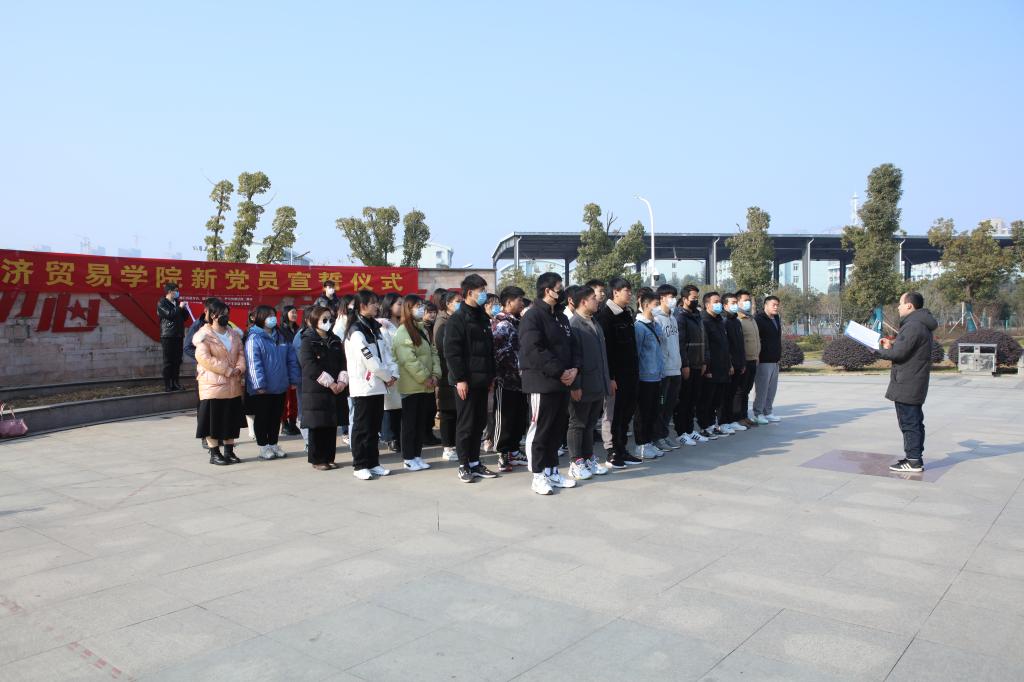 1月3日上午,经济贸易学院全体党总支支委委员和学生党支部在学校党建文化广场举行新党员团体入党宣誓仪式,党总支书记陶云龙、副书记丁蓉、党总支纪检委员曹宝亚,以及学生党支部全体党员老师参会,学生党支部组织委员张超担任主持。