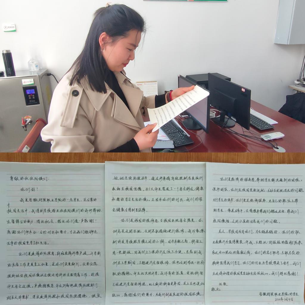 最后一组的同学们来到校园物业工作人员休息室,将一封“我得到学校物业叔叔阿姨许多热情帮助,在雷锋日的前夕,借此机会,想向你们道一声谢谢”的感谢信送到物业工作人员手中,表达了同学们对保洁阿姨们的感恩与感谢。