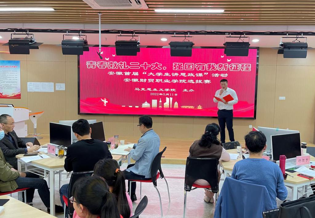 5月11日,安徽省首届“大学生讲思政课”活动beat365中文官方网站选拔赛在实训楼思政智慧实训教室举行。来自学校5个院(部)的13个代表团队参加了本次比赛。办公室主任席曦,监察审计处处长王良斌,教务处副处长房丙午,马克思主义学院副院长张少兵、崔学明及专任教师徐明教授、徐莲教授、谢征宇副教授担任评委并为获奖选手颁奖。比赛由马克思主义学院专任教师孙中天主持,全体专职教师观看了比赛。