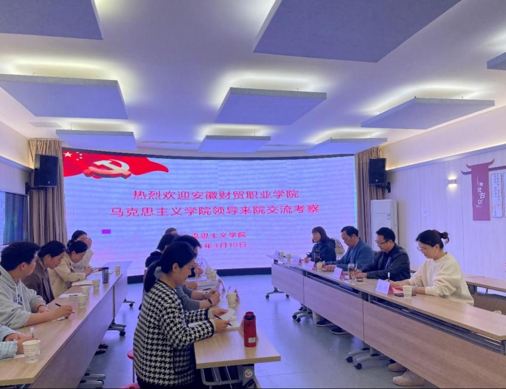 为加强思政课程教学改革和党务工作专业建设,学习兄弟院校的经验和特色,3月10日上午,马克思主义学院副院长张少兵、崔学明等前往安徽职业技术学院马克思主义学院考察交流。安徽职业技术学院马克思主义学院党总支副书记钱洁、副院长徐叶等热情接待。