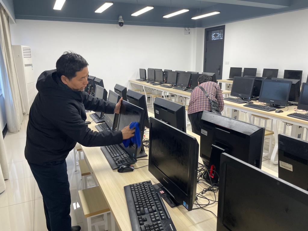 下午14时,全体党员同志和积极分子带着劳动工具在9号实训楼党建办公室集合,党支部书记吴晓光安排部署了各位党员同志的任务,对翡翠校区9号实训楼、新实训楼二楼以及蜀山校区公共机房所涉及的办公区域及32个实训机房进行精细打扫。你换水来我拖地,大家干劲十足,仔细清扫擦拭地面、门窗、栏杆等室内区域。在实训机房里,党员们伏下身、低下头,清理打扫卫生死角,清杂物、铲胶皮,充分发挥党员先锋模范作用,发扬不怕苦、不怕脏、不怕累的精神。室外虽阴雨连绵,但却浇不灭党员心中如火的热情。大家一致认识到党员义务劳动,既是一种示范,更是“践行入党誓词,不忘入党初心”的学习实践。