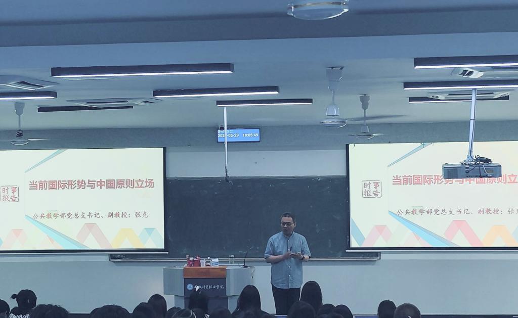 5月29日晚,公共教学部党总支书记张克在5202教室作了题为《当前国际形势与中国原则立场》专题报告,公共教学部200名青年学生参加本次报告会。