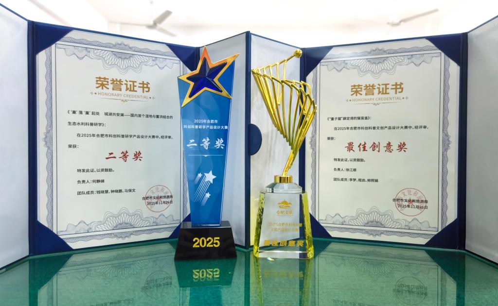 活动现场发布了2025年合肥科创科普研学产品设计大赛与文创产品设计大赛评选结果。其中文化创意学院教师何静娣、钱晓慧、钟晓鹏、马保文团队作品《“巢”落“巢”起处,城湖共安澜——国内首个生态与蓄洪相结合的水利科普研学》,以排名第二的成绩荣获研学产品设计大赛二等奖,文化创意学院师生程启、柳照娟携手学生徐江顺、李梦打造的作品《“量子猫”薛定谔的猫盲盒》,荣获文创产品设计大赛最佳创意奖。