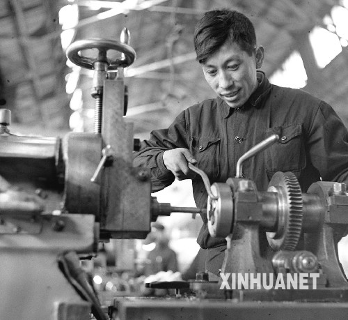 这是王崇伦在工作中(1953年摄)。1953年,我国开始实施第一个五年计划,鞍钢生产建设突飞猛进发展之时,鞍钢矿山生产一线大批凿岩机却因缺少备件卡动器被迫停止作业。年轻的高级技工王崇伦刻苦攻关,创造加工出独特工具胎“万能工具胎”,使效率提高了6倍至7倍。仅1953年,26岁的王崇伦就完成了4年17天的工作量,被誉为“走在时间前面的人”。 新中国成立60年来,从大江南北到长城内外,一代代青年在党的引领下,挥洒汗水、奉献智慧和热情,怀着赤子忠诚为祖国的事业不懈奋斗,在建设改革的实践中建功立业…… 新华社发