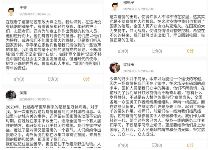 近2个小时的课程中,4位教授娓娓道来,让同学们感慨颇深,同时也加深了大家对中国特色社会主义制度显著优势的认识,进一步坚定了“四个自信”,对打赢这场疫情防控阻击战充满了信心。我院的同学们参与度非常高,大家发言热烈,纷纷在讨论区里表达自己的心中所感。
