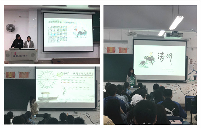 在徐明老师的课堂上,同学们分享了春秋时期义士介子推与清明节的渊源,讲述了蕴含在清明节里的忠孝礼义。在侯青云老师的课堂上,会计1801班的张乐平和李航同学以一副中国画为背景分享了杜牧的七言绝句《清明》,赏析了古诗词中关于清明节气、习俗及人们情感的描写。在江艳老师的课堂上,同学们从清明节的由来、清明节的习俗、清明节的传统文化等三个角度介绍了自己对于清明的认识,阐述清明既作为一个节气也作为一个节日的双重意义。在魏磊老师的课堂上,一位苗族的同学分享了苗族的清明节祭祀活动及礼仪,该班级其他同学表示,这次主题课堂真是长了不少知识。