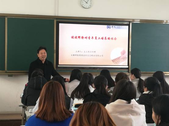 课堂中主总以亲切和蔼的姿态与学生进行交流互动,课堂气氛活跃,生动有趣,学生受益匪浅。学生们都表示此次专业讲座让他们对自身有了清晰的定位,也让他们对以后的职业发展充满了期望和激情,激发了他们学习与前进的热情。(供稿:汤志飞 审稿:宋鹤年)