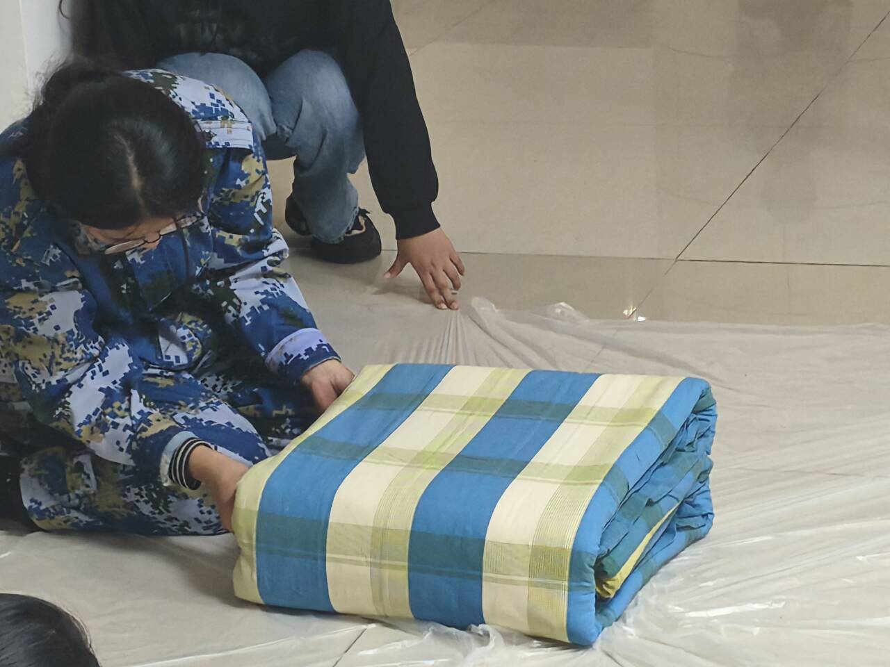 决赛现场氛围热烈,团总支工作人员全程保障赛事秩序。入围选手屏气凝神、动作利落,通过铺平、压实、折边、修角等步骤,将蓬松棉被塑造成棱角分明的“豆腐块”,每处折痕都彰显细致与耐心。最终,比赛评选出一等奖2名、二等奖4名、三等奖6名。