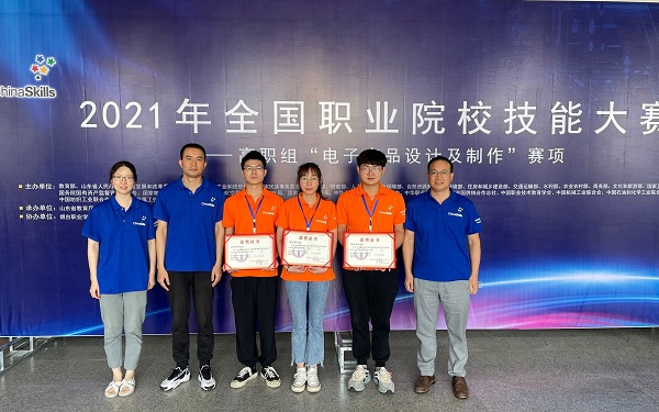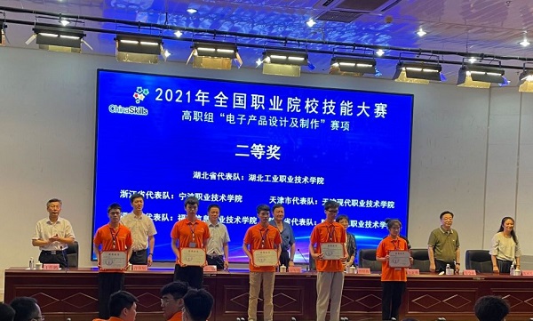 新闻网讯(通讯员王俊亚)6月20日,2021年全国职业院校技能大赛高职组“电子产品设计及制作”赛项在烟台职业学院闭幕,由pg娱乐pg娱乐电子游戏官网入口应用电子技术专业刘竹林技能名师工作室(王庐山、刘竹林、王俊亚)指导,胡昌、卢存勇、周紫欣同学组成的技术团队代表湖北省参赛,他们与全国27所代表本省最高水平的顶尖院校选手同台竞技,经过连续8小时的激烈角逐,最终获得该赛项二等奖第1名的好成绩。