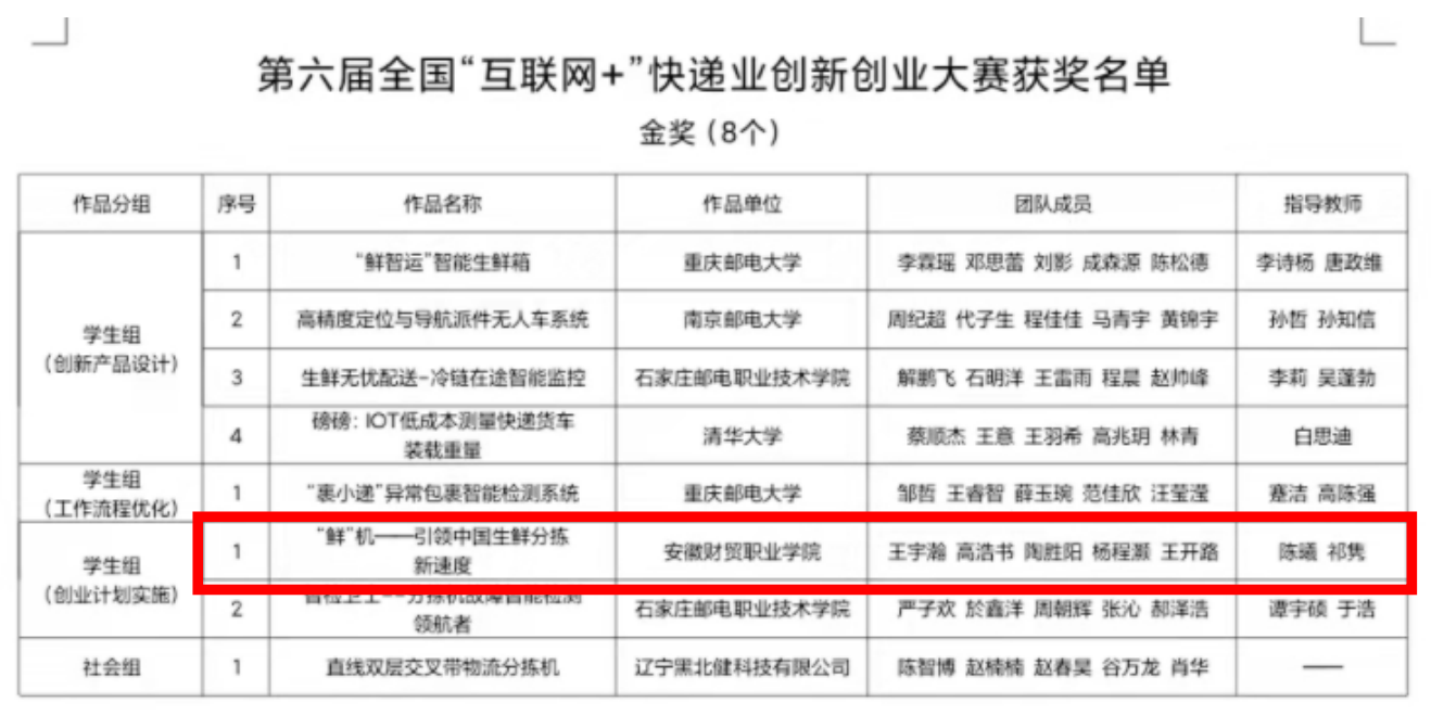 近日,国家邮政局印发《关于公布第六届全国“互联网+”快递业创新创业大赛获奖结果的通知》,学校荣获本次大赛特别贡献奖和优秀组织奖,经济贸易学院学生团队参赛作品《“鲜”机——引领中国生鲜分拣新速度》荣获金奖。