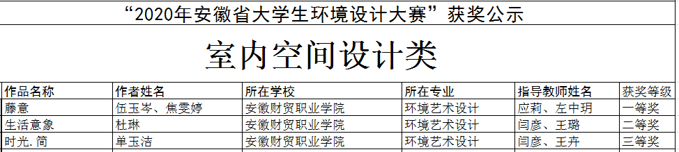 本次大赛分为室内空间设计类、景观与规划设计类等四个类别。其中由环境艺术设计专业学生伍玉岑、焦雯婷设计的参赛作品《藤意》获得室内空间设计一等奖;学生杜琳设计作品《生活意象》获得室内空间设计二等奖;单玉洁设计作品《时光?简》获得室内空间设计类三等奖。