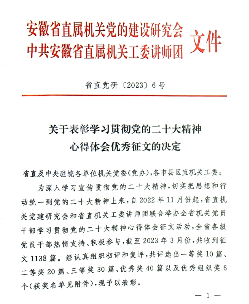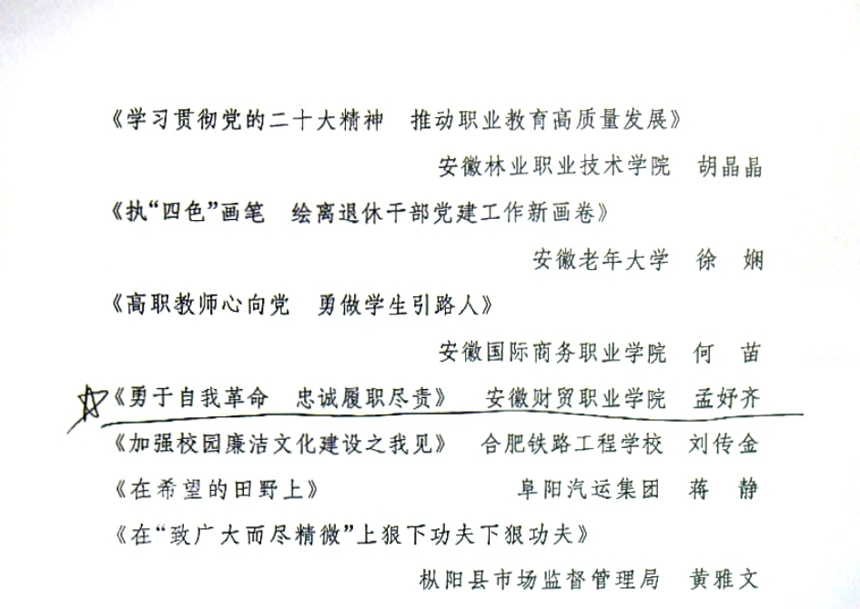 近日,由安徽省直属机关党的建设研究会和中共安徽省直属机关工委讲师团联合举办的全省机关党员干部学习贯彻党的二十大精神心得体会征文活动获奖名单公布,我校监察审计处教师孟妤齐的《勇于自我革命 忠诚履职尽责》一文在全省1138篇征文中脱颖而出,获得优秀奖。