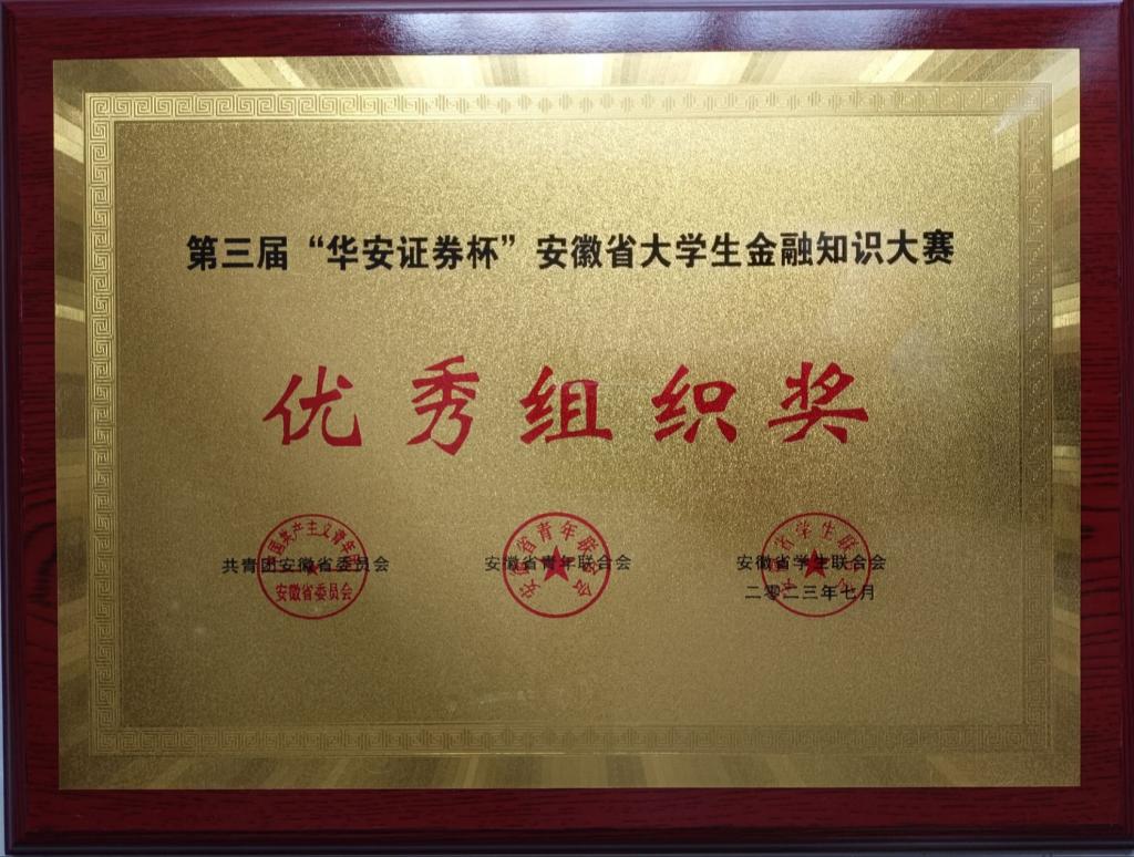 近日,由共青团安徽省委、安徽省青联、安徽省学联联合主办,华安证券股份有限公司承办的第三届安徽省“华安证券杯”大学生金融知识大赛圆满谢幕。校团委荣获“优秀组织奖”,我校陈赵鹏和任雪峰两位同学荣获“优秀个人”。