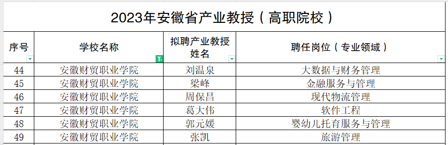 近日,安徽省教育厅、安徽省人力资源和社会保障厅联合下发《关于公布2023年安徽省产业教授名单的通知》,经岗位发布、院校推荐、资格复审、网上公示等程序,2023年度拟聘用安徽省产业教授(兼职)301名,其中高职院校产业教授244名。我院推荐的刘温泉、梁峰、周保昌、葛大伟、郭元媛、张凯等6人成功获批为安徽省产业教授。