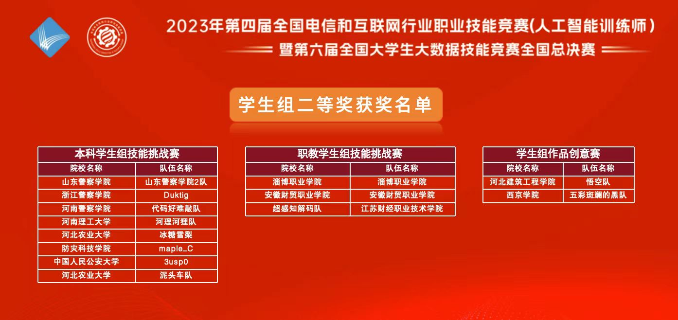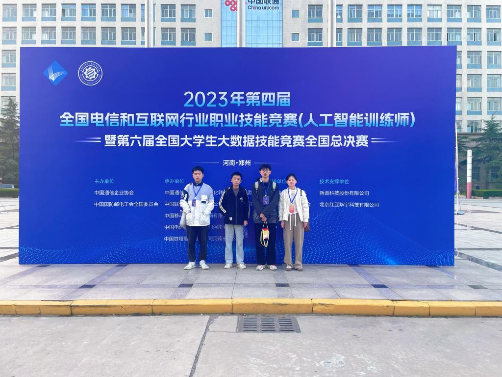 12月8日,2023年第四届全国电信和互联网行业职业技能竞赛(人工智能训练师)暨第六届全国大学生大数据技能竞赛全国总决赛于郑州市河南省邮电学校举行,由周姣、张倩指导的黄一心、程骏、臧国栋团队,荣获职教学生组全国总决赛二等奖。