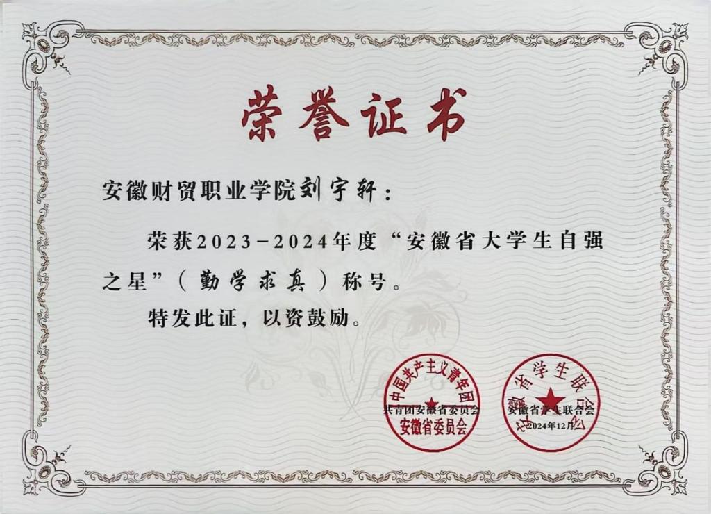 近日,由团省委、省学联组织开展的2023—2024年度“安徽省大学生自强之星”奖学金评选活动结果揭晓,学校刘宇轩、陆金宝两位同学荣获“安徽省大学生自强之星”荣誉称号。