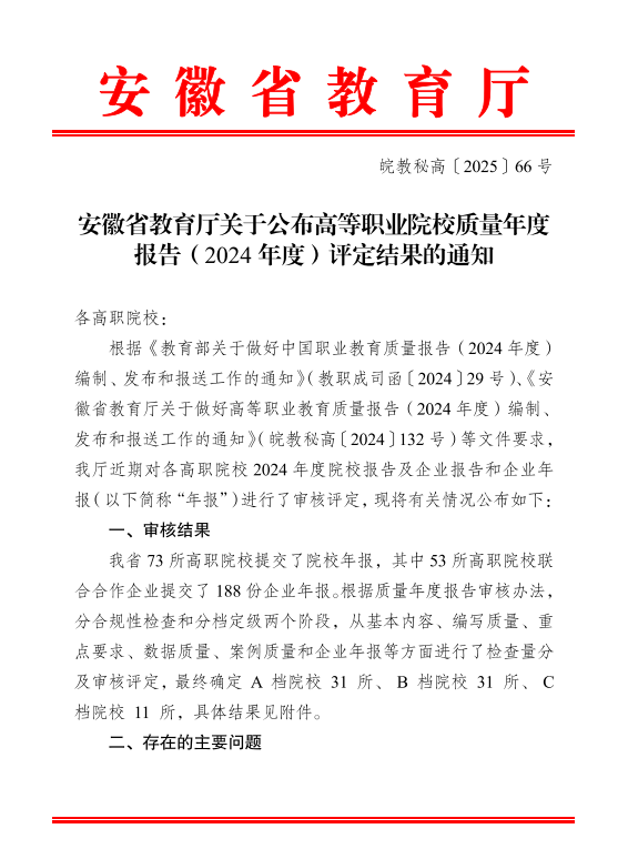 近日,安徽省教育厅公布高等职业院校质量年度报告(2024年度)评定结果,我校质量年度报告(2024年度)荣获A档。我校自2020年省教育厅组织质量年报评审以来,已连续五年获得A档。