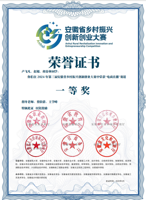 由省农业农村厅、省教育厅、省住建厅、省人力资源社会保障厅、省商务厅和省文化和旅游厅联合主办的第三届安徽省乡村振兴创新创业大赛颁奖典礼在蚌埠举行。我校学生共获得一等奖1项、三等奖1项。