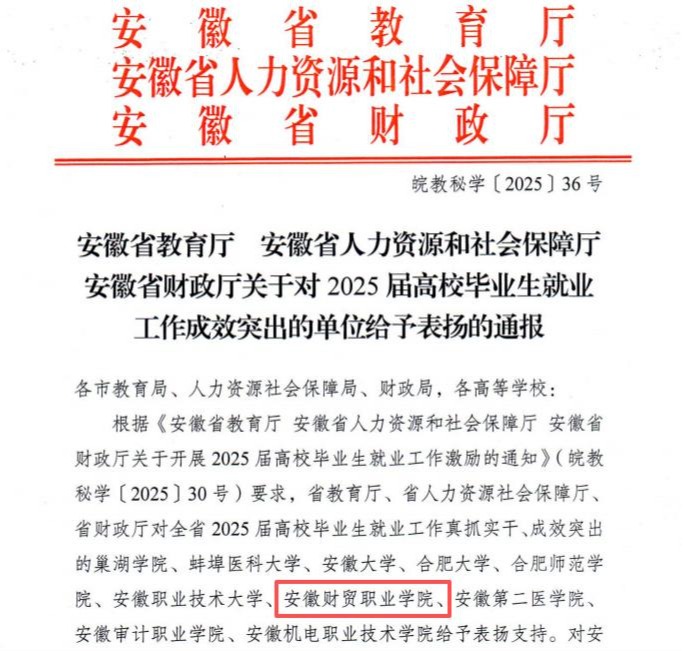 近日,安徽省教育厅、安徽省人力资源和社会保障厅联合下文,公布了安徽省2025年度普通高校毕业生就业工作成效突出单位名单,我校荣获全省激励表扬。